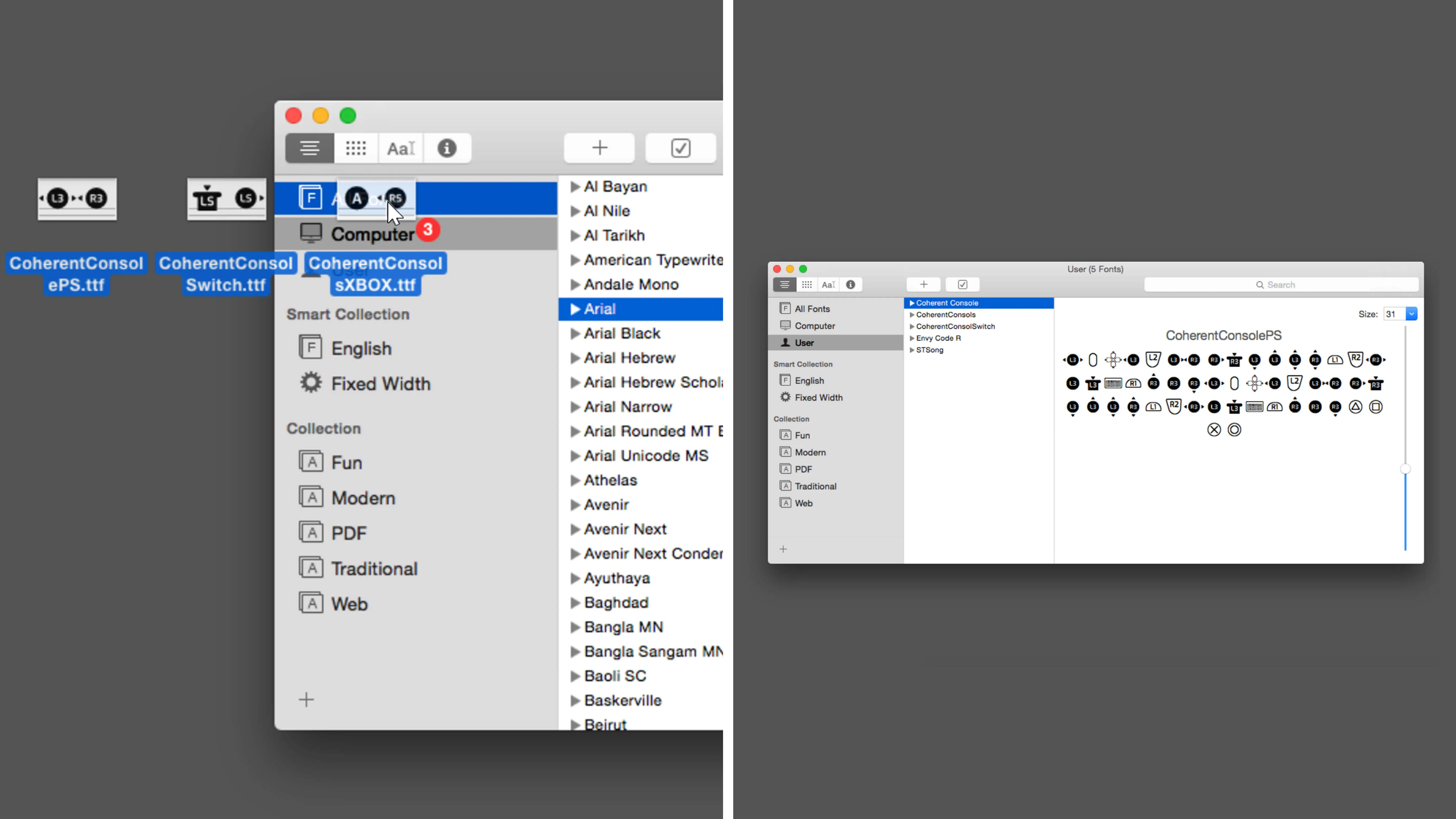 To install Coherent Console Fonts on MacOS, open Font Book, then drag and drop the files into the app. You’re done.