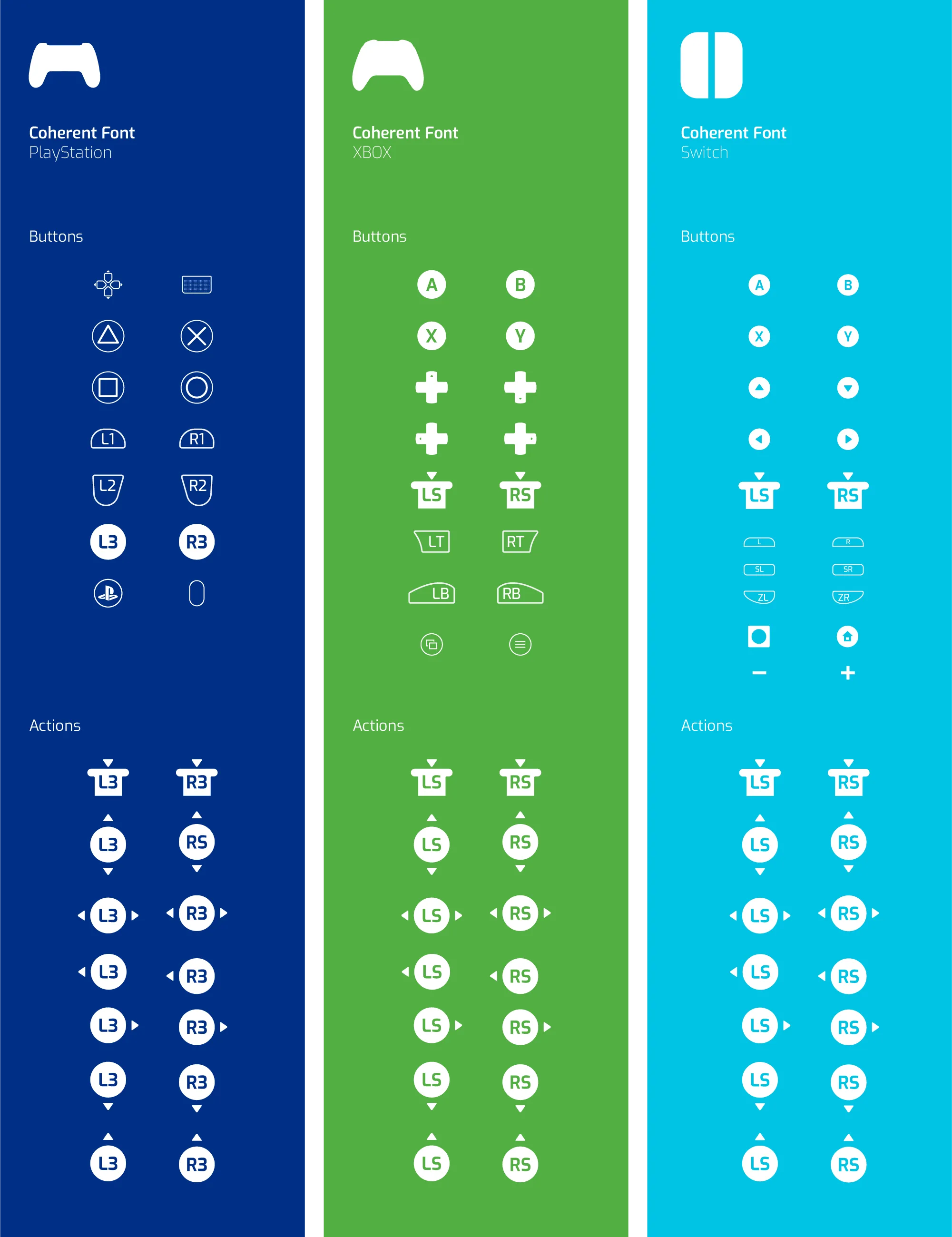 Each one of the Coherent Fonts represents the main control buttons from the console’s controller. There are three available fonts – one for each of the biggest names on the market – PlayStation, Xbox & Nintendo Switch.