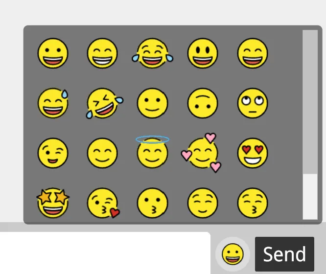 1<div id="form">2 <input3 id="input"4 autocomplete="off"5 />6 <div class="chat-buttons">7 <button class="open-emojis-panel-btn"></button>8 <button class="open-emojis-panel-btn">😀</button>9 <button class="send-btn">Send</button>10 </div>11</div>Additionally, use the coh-font-fit property to adjust the emoji’s size to automatically fit within the button element. Previously, the background-image style used the contain property for this purpose.