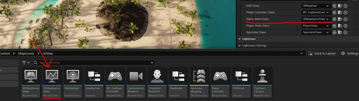 The major part of our logic will be handled and managed by the Game State Blueprint. In our case, we named it 3DMapGameState.