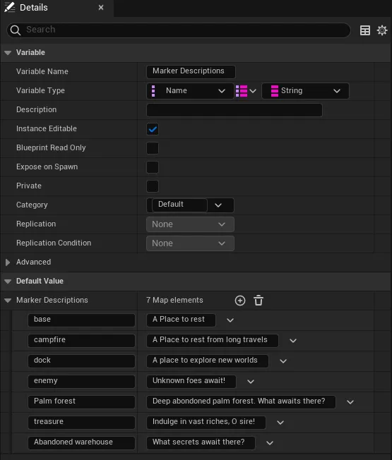 POIand set them in theActor POIarray. - Loop through the array and for each entry, get the tag with index 0 - which is the POI’s type (enemy, treasure, etc.) and find the corresponding