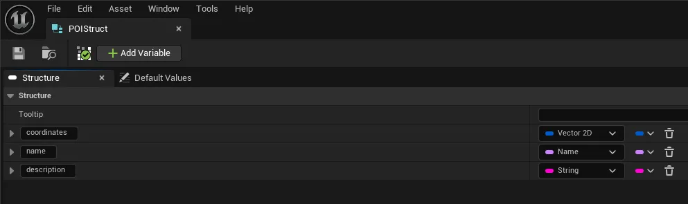 In the content browser, create a POIStruct that will hold all the information we need for the POIs. Create a struct with fields: