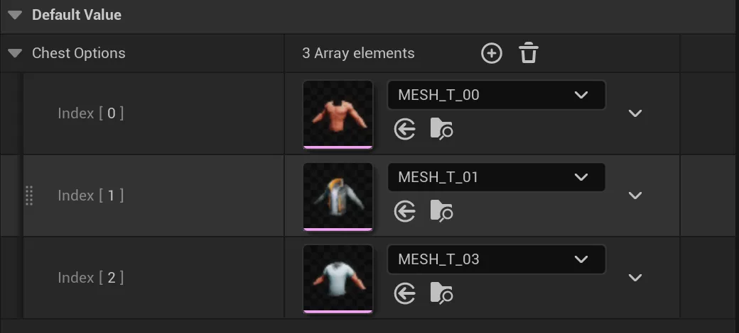 • Set the default value of Chest Options to include all customizable chests. In our example, the Stylized Character Kit provides 3 chests, so add 3 items and set their values to the corresponding chest meshes.
