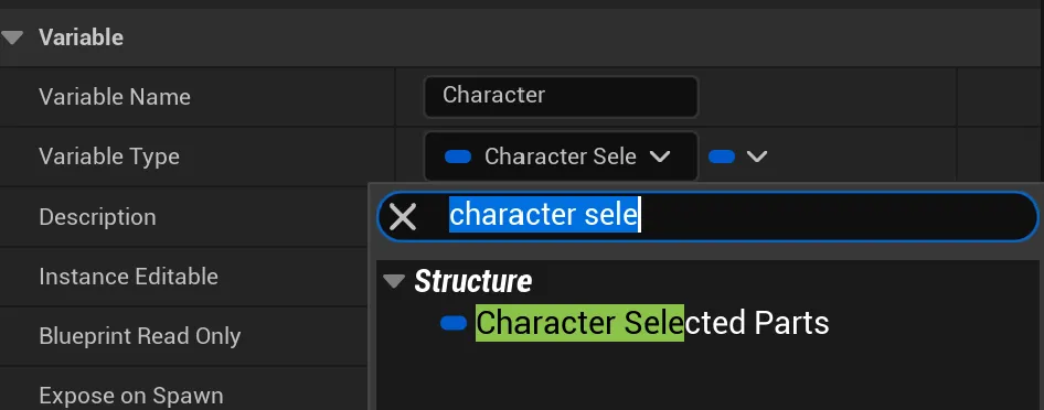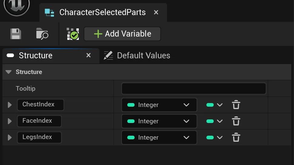 To achieve this, we first need to define a structure called CharacterSelectedParts that will hold the active index for each customizable character part.
