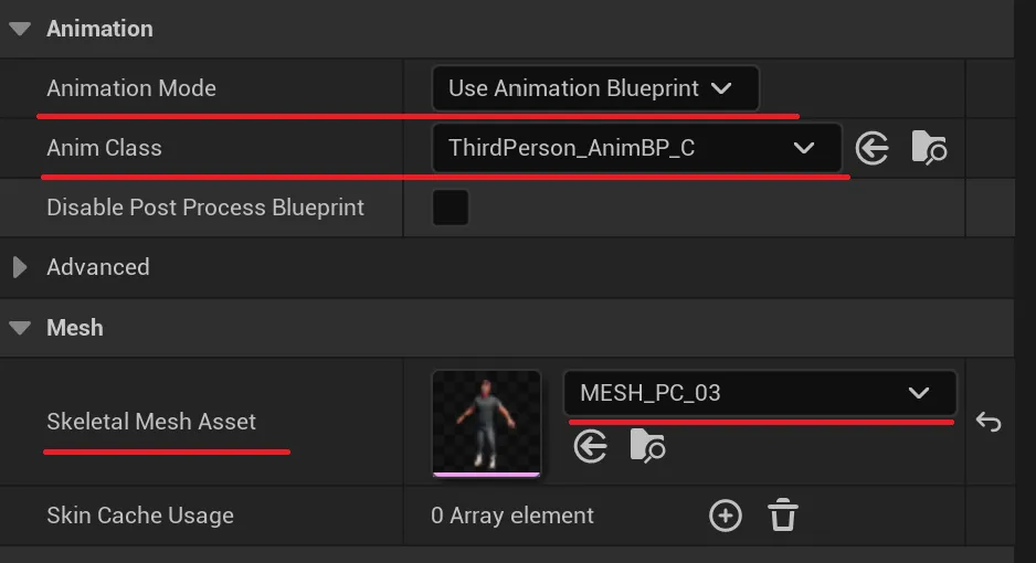 • Set the Anim Class in the Details menu to ThirdPerson_AnimBP_C to apply animations to the mesh.
