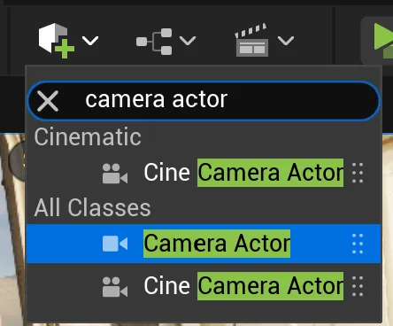 To create a camera actor, use the menu to create objects and search for Camera Actor.