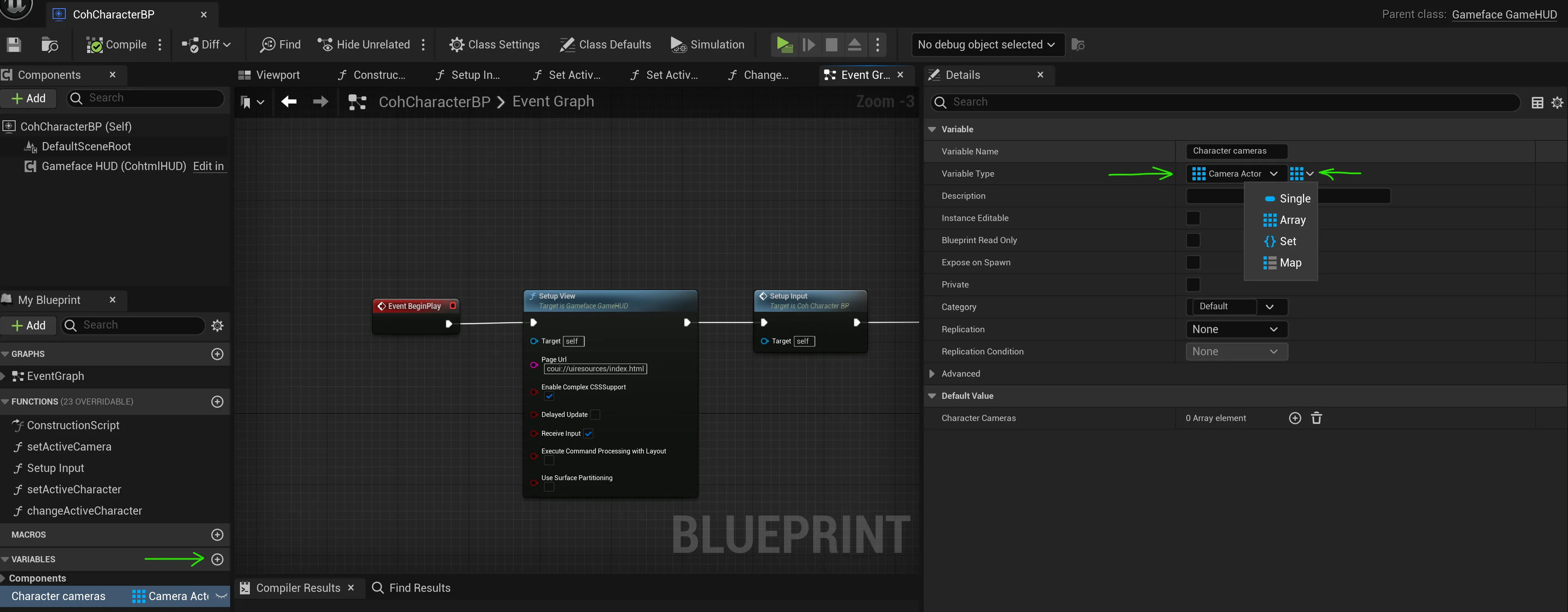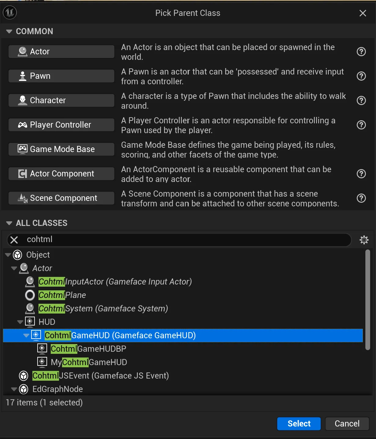 Now that the cameras are positioned, it’s time to implement the character selection logic. We’ll create a HUD class blueprint to handle the level’s logic. Start by creating the CohCharacterBP, inheriting from the CohtmlGameHUD class:
