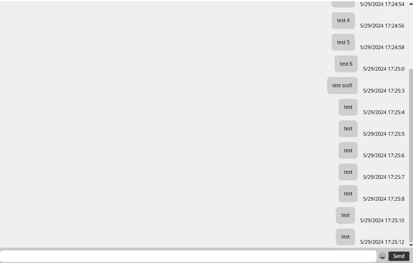 1if (id === socket.id) {2 waitForFrames(() => messagesContainer.onScrollSlider({ detail: { handlePosition: 100 } }), 7); // Scrolls the slider and container to 100% where the last message is3}Know issue: There is a need to wait for 7 frames to ensure the scrollable container correctly scrolls to the last message. The scrollable container automatically resizes when a new list element is appended, which takes about 6 frames.