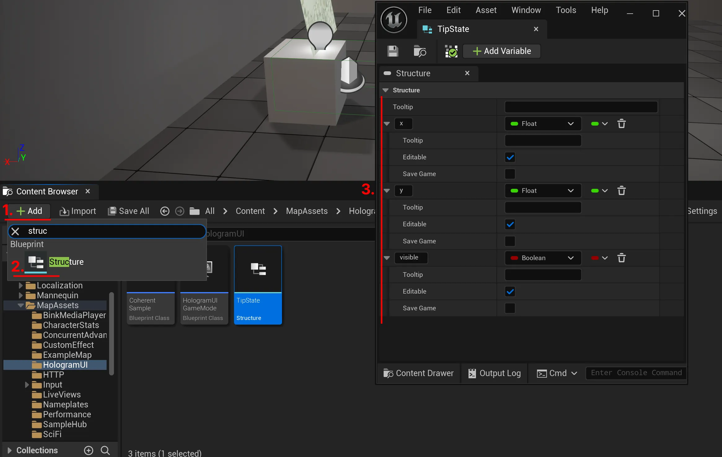 CustomProperties Pin (PinId=C11C5E7340349D07698EFEB775B05D73,PinName="TipState",PinType.PinCategory="struct",PinType.PinSubCategory="",PinType.PinSubCategoryObject="/Script/Engine.UserDefinedStruct'/Game/MapAssets/HologramUI/TipState.TipState'",PinType.PinSubCategoryMemberReference=(),PinType.PinValueType=(),PinType.ContainerType=None,PinType.bIsReference=True,PinType.bIsConst=True,PinType.bIsWeakPointer=False,PinType.bIsUObjectWrapper=False,PinType.bSerializeAsSinglePrecisionFloat=False,LinkedTo=(K2Node_VariableGet_6 6BF0CCC7439BEAA901D38E8E940A34AF,),PersistentGuid=00000000000000000000000000000000,bHidden=False,bNotConnectable=False,bDefaultValueIsReadOnly=False,bDefaultValueIsIgnored=False,bAdvancedView=False,bOrphanedPin=False,)